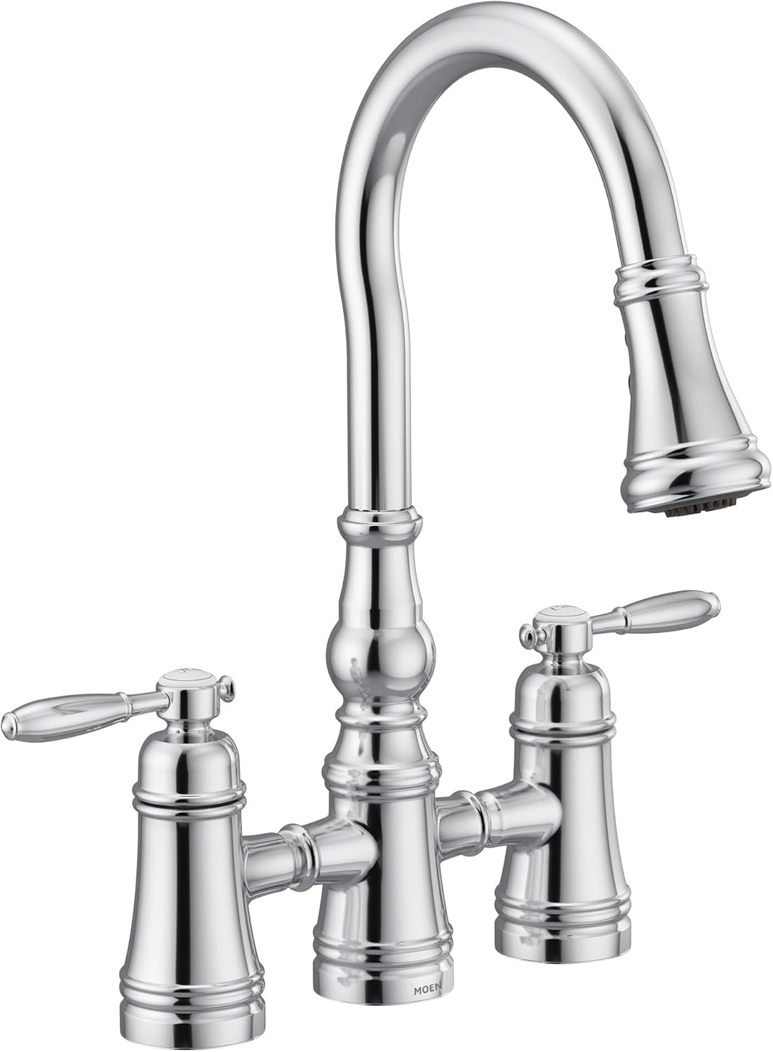 Timeless and full of charm, the traditional Weymouth pulldown kitchen faucet embodies the fresh farmhouse look consumers desire. Its distinctive accents include a refined shepherd's hook spout and porcelain inlays with antiqued decorative script – both in English and French – to provide the ultimate in customization. The faucet features Moen’s Power Boost™ technology, which provides a faster clean and a faster fill with the push of a button, as well as the Reflex® system to ensure smooth operation and secure docking of the spray wand.