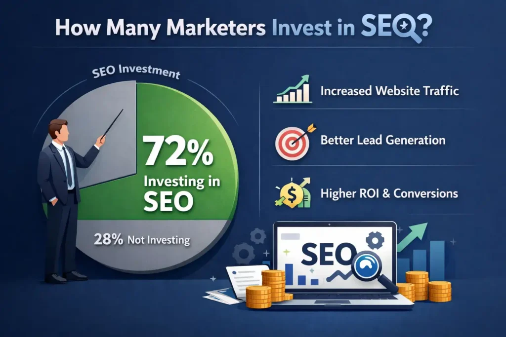64% of marketers actively invest in SEO. This statistic underscores the importance of SEO in driving organic traffic and improving online visibility.
