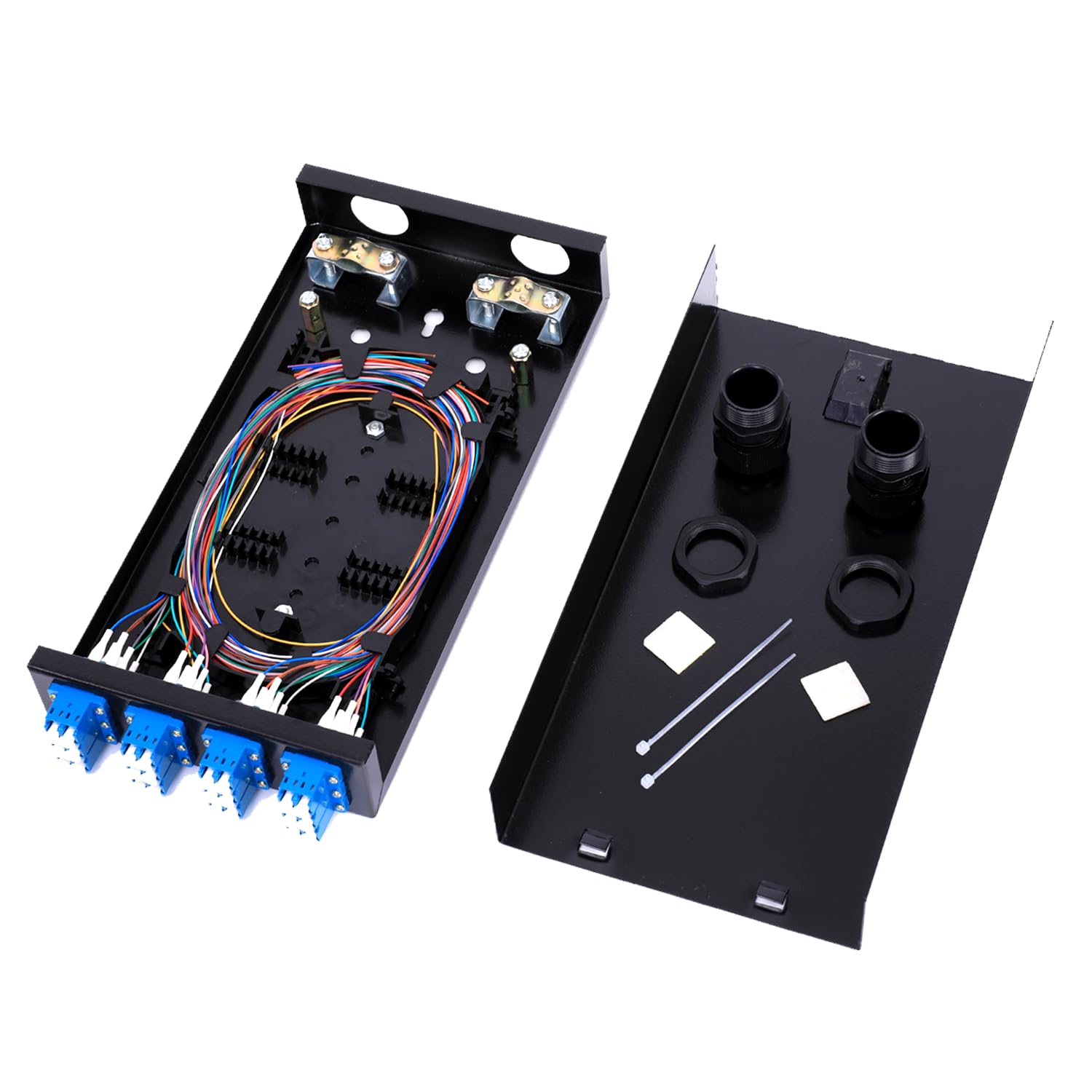 Fiber Optic OM3 Kit: 6 Port Duplex LGX Loaded Panel - Set of Accessories is Complete Include 12 Strand LC Multimode Pigtail + Duplex Fiber Couplers, The Optical Fiber Couplers is Configured and Fiber Pigtail cables are inserted neatly. Cost Effective and Built to Last - Commercial Grade Construction: Durable OM3 LC Duplex fiber optic connectors with Riser OFNR PVC 2.0mm zipcord jacket meet industry standards for flammability. Compatible with all standard fiber optic equipment and connectors, ideal for indoor use. - Compliance and Specifications: Compliant with ITU, UL, CE, IEC, TIA, RoHS standards. Operates at 850nm wavelength with LSZH jacket, -4° to 158°F operating temperature range, and G.652D fiber grade. Minimum bend radius of 15mm ensures reliable performance. Easy to Use - Secure Fiber Enclosure: Ensures a completely secure space for fiber with unmatched integration into wiring closets and wall-mount installations. - Flexible Deployment: Supports both LC and SC connector types with flanged couplers, offering versatility without the need to choose between fiber patch panel types. Application - Versatile Use: Ideal for Telecom, Datacom, Storage Networks, CATV, Multimedia applications, and Long Haul/Metro/Access networks. Designed for Fiber to the FTTX test, ensuring comprehensive deployment capabilities. Parameters - OM3 Multimode LC Pigtail: 12 strands of OM3 Multimode fiber with LC connectors, providing flexibility in connector types and lengths to suit various applications. Standards conform to YD/T926I, ISO/IEC 11801, TIA/EIA-568-B. - Color-Coded for Efficiency: Each of the 12 strands is individually color-coded, simplifying identification and preventing incorrect patching during installation.