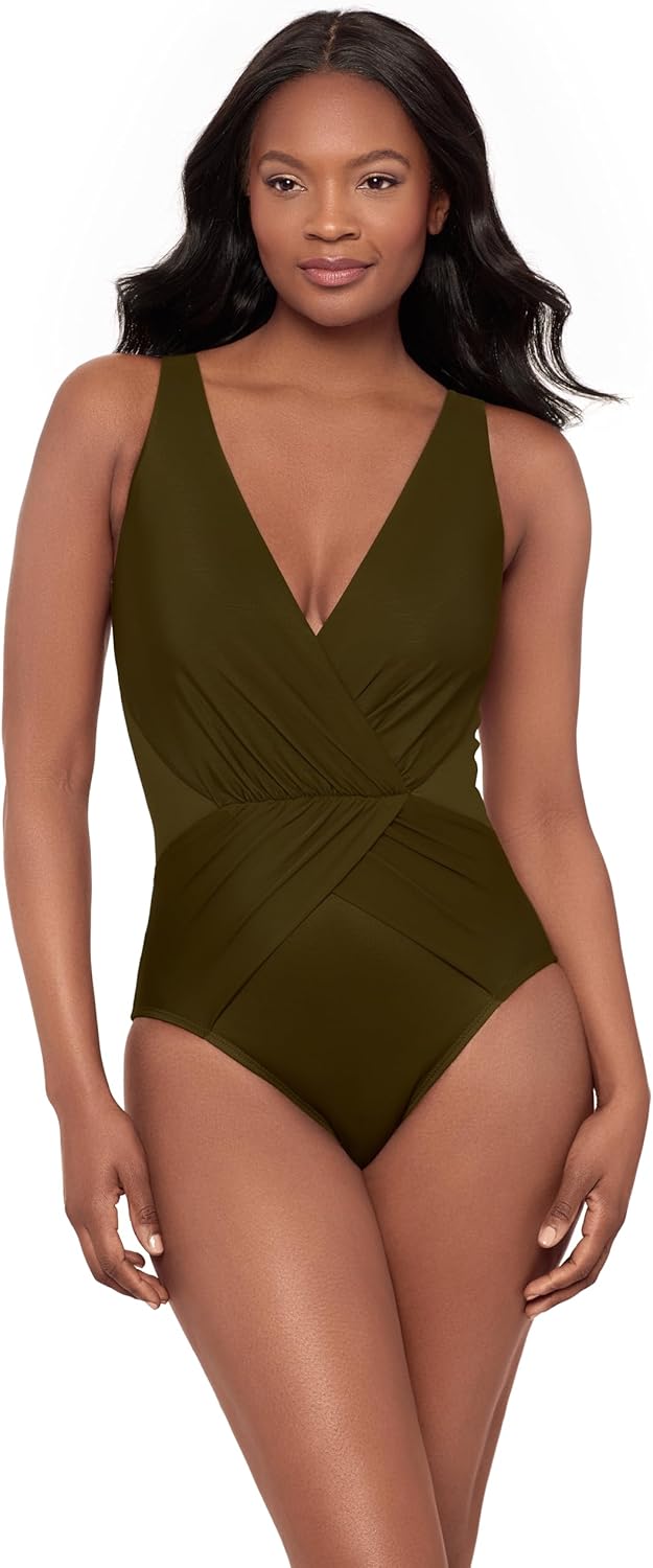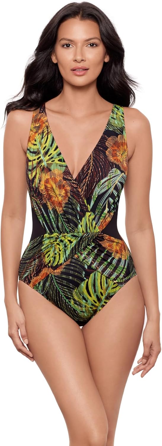 Designed to sculpt and flatter, this suit is your secret weapon for total confidence at the beach. The power of Miratex fabric smooths and shapes your silhouette from every angle, giving you a sleek, contoured look without any extra effort. Soft cups provide just the right amount of gentle shaping, ensuring all-day comfort. Strategically placed mesh insets add a chic, modern touch while enhancing your curves—creating the illusion of an ultra-defined waistline. It's the perfect blend of fashion and function, made to move with you. "Look 10 lbs. lighter in 10 seconds” is more than just a tagline – it’s a promise. Our unique and innovative Miratex® fabric delivers three times the control of ordinary swimwear fabrics while remaining totally comfortable and allowing full range of motion. There are no panels or linings – just slimming, slenderizing control for all over shaping you need to see to believe. All Miraclesuit swimwear features sophisticated prints and sleek, contemporary styling that’s on trend and totally timeless. At Miraclesuit, we believe in curves. Strategic draping and shirring create an hourglass shaped silhouette, which helps highlight your best features. This swimsuit is made for any body type and flatters every unique figure. When a woman wears her Miraclesuit, she feels confident and beautiful both inside and out. Miraclesuit is created like no other swimsuit in the world. Try it on once and you'll love it forever, guaranteed.