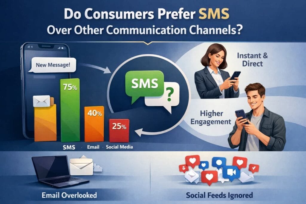 85% of consumers prefer receiving text messages over a phone call or email. This preference is due to the convenience, immediacy, and non-intrusive nature of SMS.