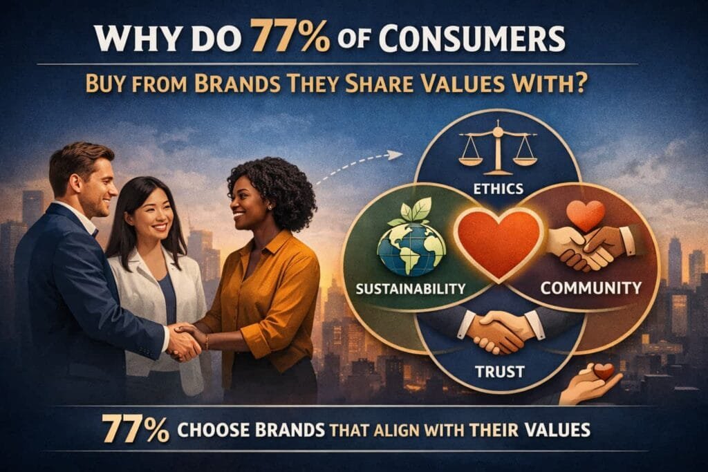 77% of consumers buy from brands they share values with because shared values create a strong emotional bond. When consumers see that a brand stands for the same things they do, they feel a sense of alignment and trust. This emotional connection drives purchasing decisions and fosters loyalty, as consumers prefer to support brands that reflect their beliefs and values.